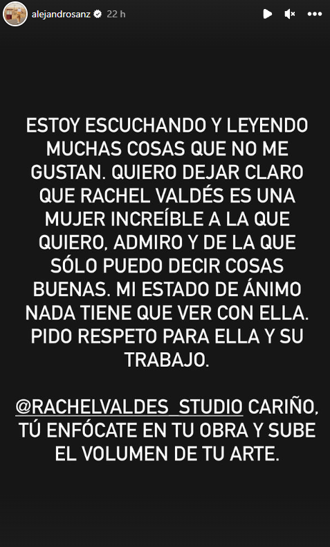 No obstante, el madrileño salió a defender a Valdés por medio de su cuenta de Instagram, donde entregó su total apoyo. “Estoy escuchando y leyendo muchas cosas que no me gustan. Quiero dejar claro que Rachel Valdés es una mujer increíble a la que quiero, admiro y de la que sólo puedo decir cosas buenas”.