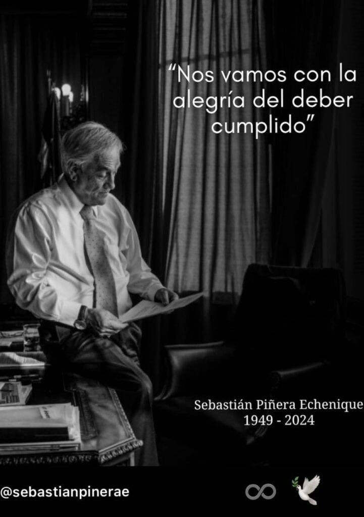 Se trata de una imagen en blanco y negro de Piñera, acompañada por una de sus frases: “Nos vamos con la alegría del deber cumplido”.