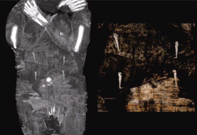 La momia no ha sido abierta, pero una de las radiografías muestra que la mujer tenía el pelo largo y rizado, que le llegaba hasta los hombros.