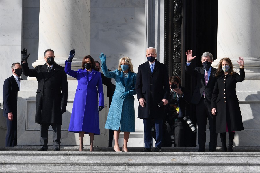 Harris, de 56 años, acudió acompañada de su marido, Doug Emhoff, y eligió un conjunto azul para la ceremonia que se celebra en el frontis del Capitolio, pero que este año se desarrollará sin público, con un conjunto de banderas estadounidenses para representar a los 400.000 muertos por la pandemia.
