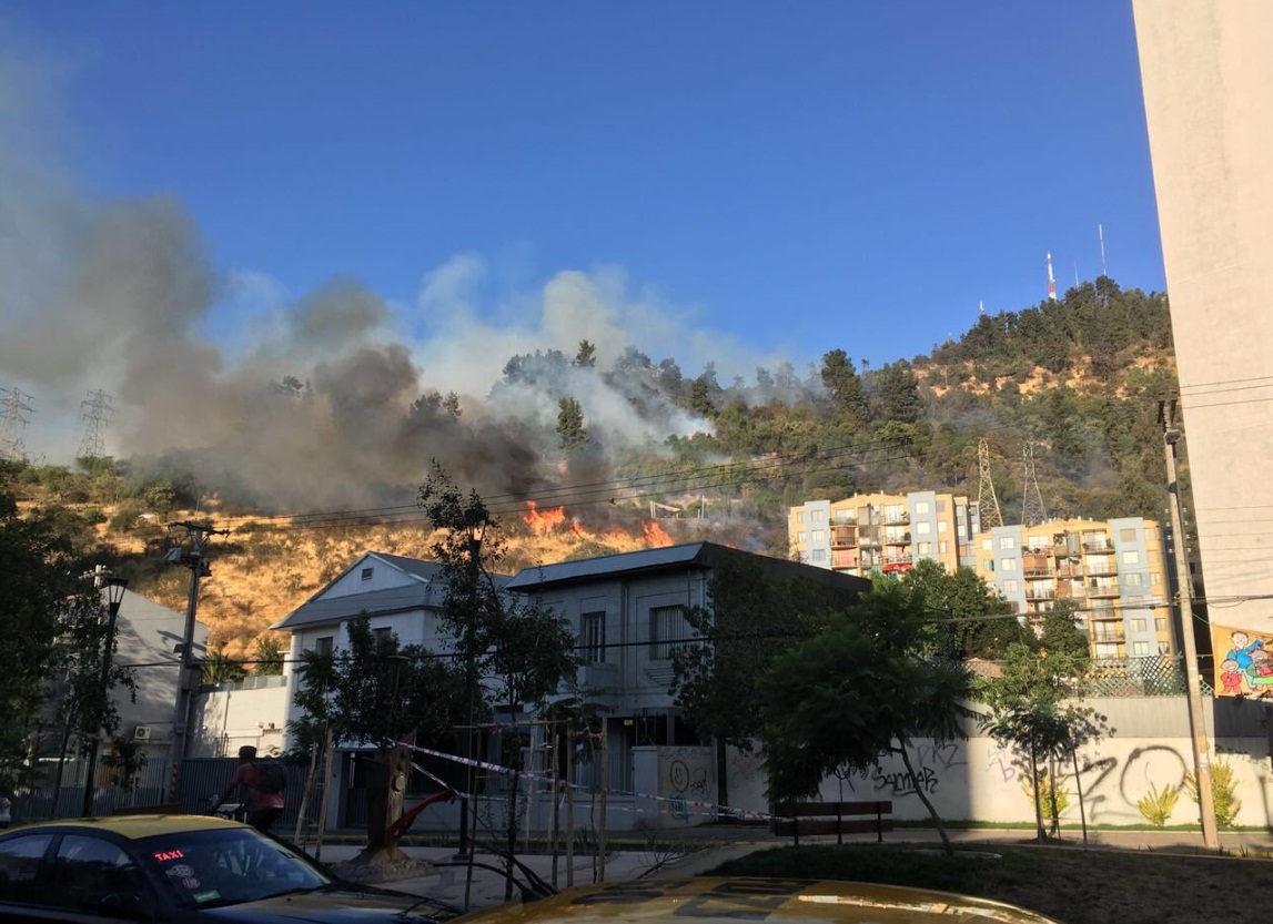 Bomberos se encuentra combatiendo un incendio que se produjo en una de las laderas del cerro San Cristóbal. Las llamas afectan al sector que da a la calle Santos Dumont, en la comuna de Recoleta.