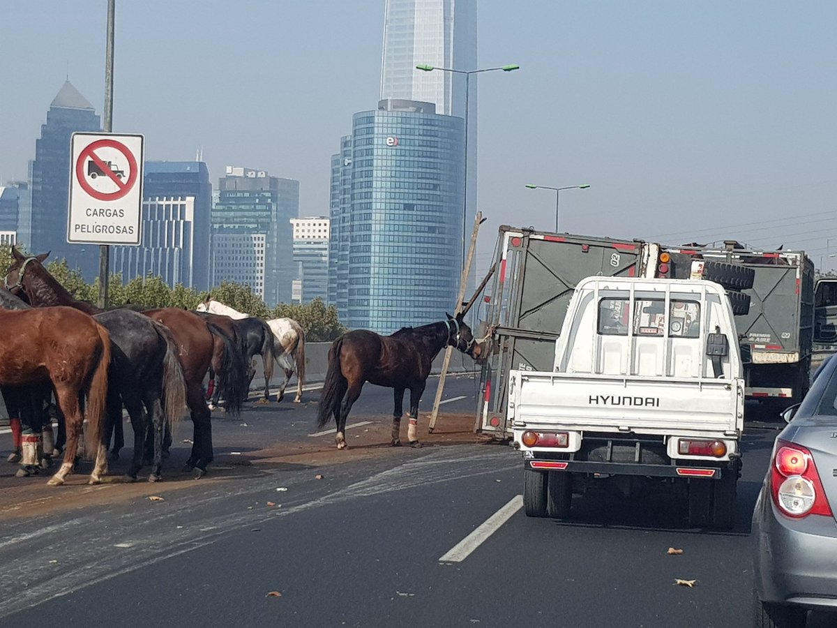Un espectacular accidente se produjo en la mañana de este lunes en la Costanera Norte, que involucró un camión que transportaba 16 caballos. Según el informe preliminar, la máquina que transportaba a los animales se volcó tras colisionar con un vehículo menor a la altura de Lo Saldes.
