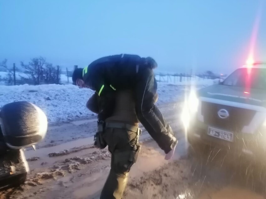 El hecho ocurrió en el sector cordón Baquedano, en el kilómetro 28 de la ruta, donde los efectivos encontraron la moticicleta volcada y a unos 40 metros estaba una persona cubierta por un saco de dormir para combatir las condiciones climáticas que eran de viento y nieve.