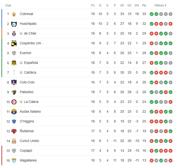 Con la mayoría de los partidos disputados de la fecha 18 del Campeonato Nacional, la tabla de posiciones sufrió algunos cambios después de algunos resultados, pero quien se mantiene en la cima como puntero sólido del fútbol chileno, sigue siendo Cobresal.