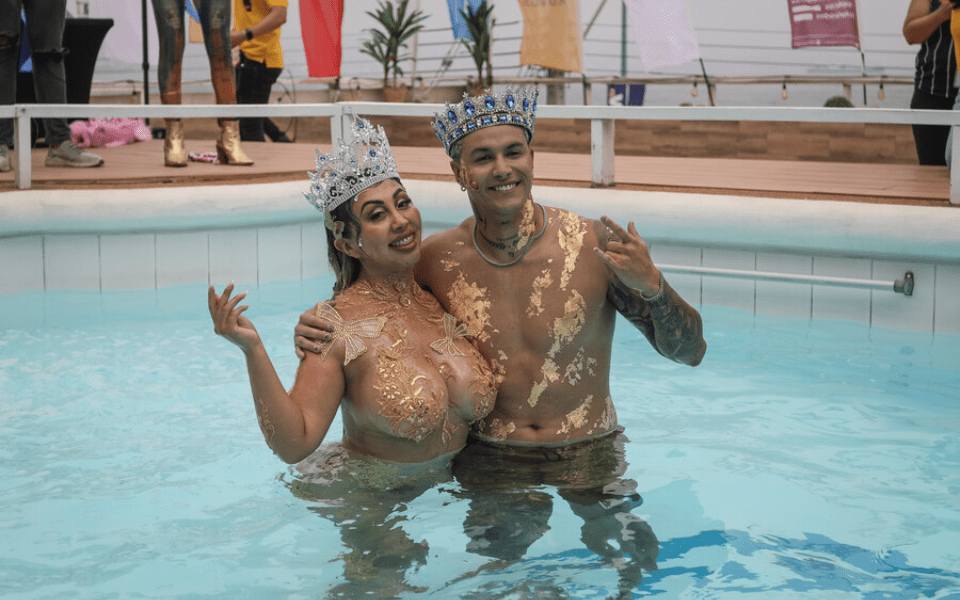 La pareja arribó al recinto con sus cuerpos pintados con detalles dorados y dos bailarinas drag queen, quienes le quitaron la bata a la creadora de contenido, revelando su look.