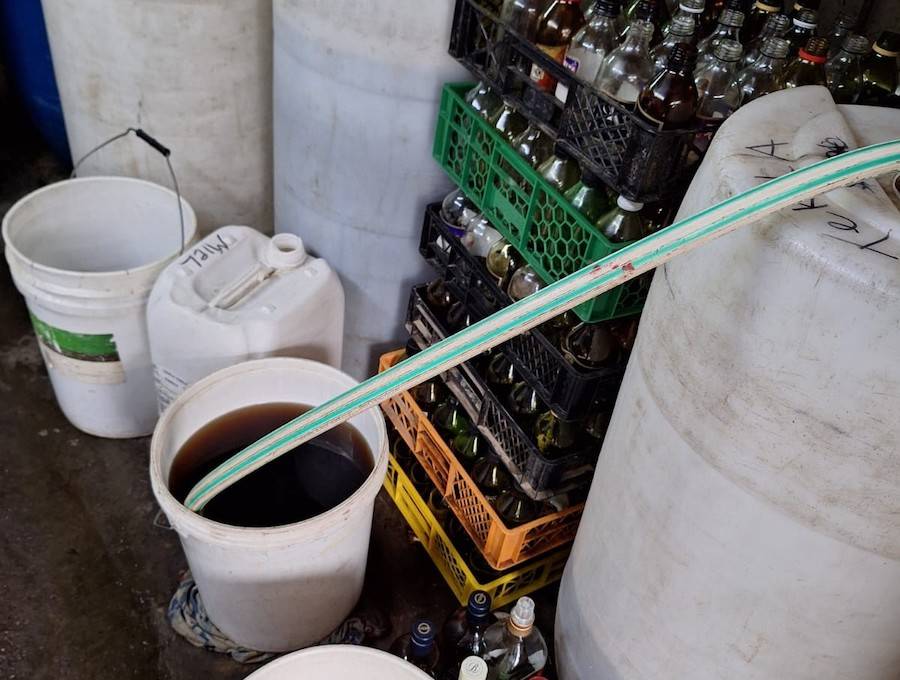 Además, se decomisaron cerca de 1.200 botellas de licor falsificadas, junto con toneles con bebidas alcohólicas, mangueras, máquinas de envasado y etiquetas.