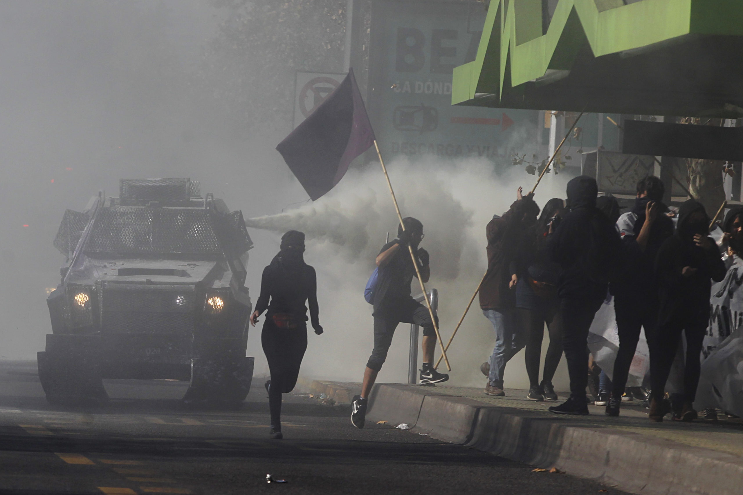 Manifestantes encapuchados siguen causando disturbios y enfrentamientos con @Carabdechile, alejados de toda reivindicación y demanda feminista. Hasta cuándo! Así no se defienden ni se exigen derechos. pic.twitter.com/Sbr067c9Fj