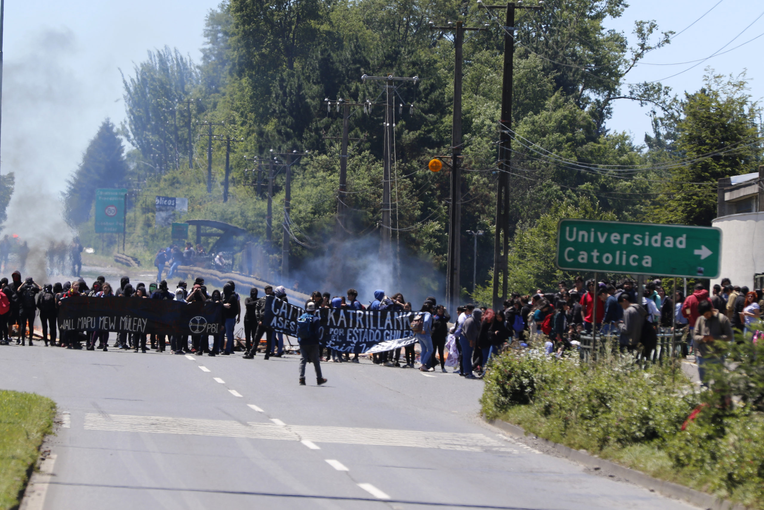 Estudiantes de la Universidad Católica de Temuco realizan la tarde de este jueves una protesta por la muerte de Camilo Catrillanca y mantienen bloqueado el acceso norte de la ciudad.