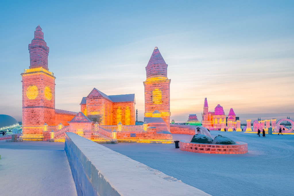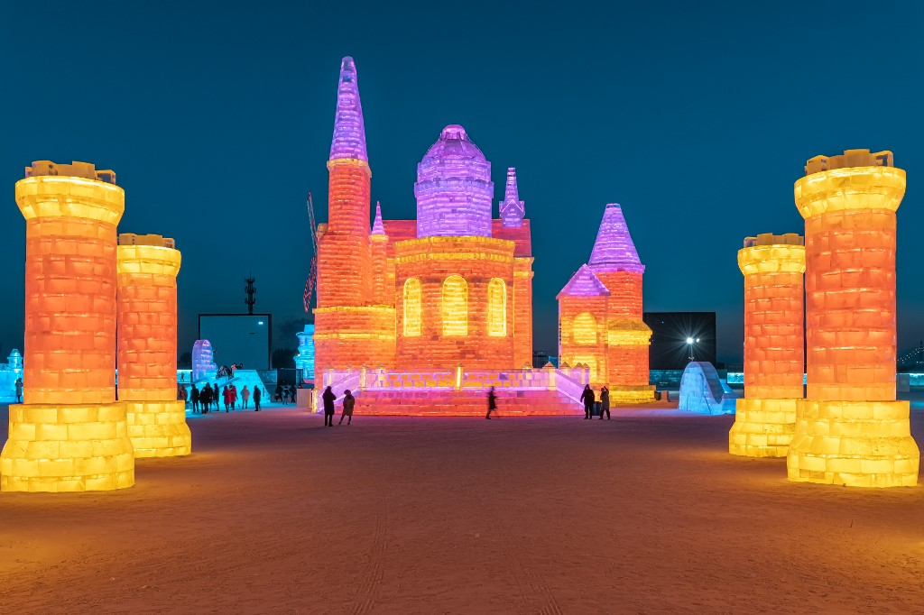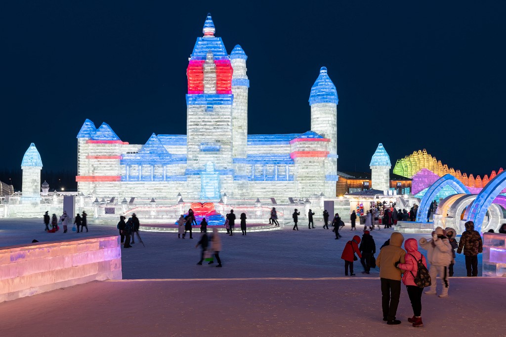 Gigantescos laberintos de nieve, torres heladas iluminadas y palacios de cristal creados a partir de grandes bloques de hielo deslumbran a los visitantes del festival anual de hielo de Harbin, en China.
