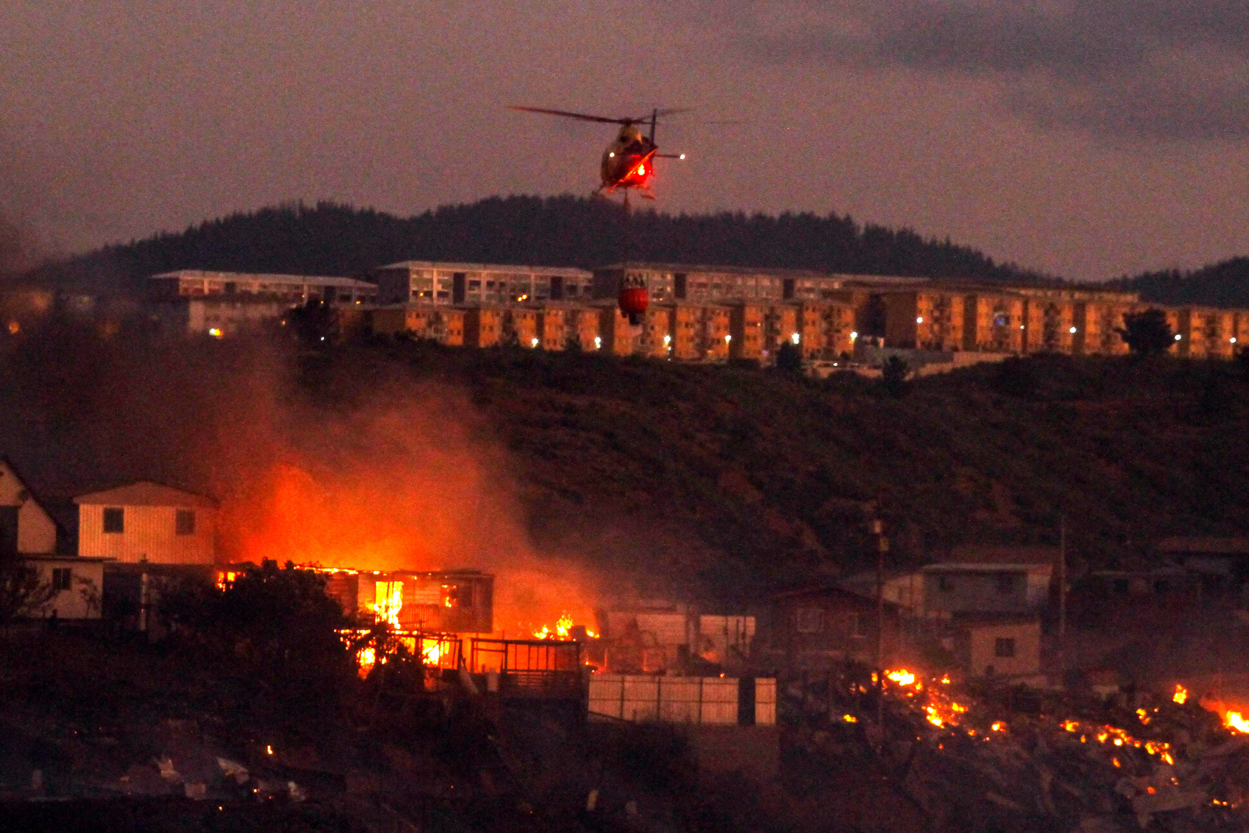 El subsecretario del Interior, Manuel Monsalve, dijo cerca de la medianoche que "el Presidente de la República ha instruido declarar Estado de Excepción Constitucional de Catástrofe por Calamidad Pública. El decreto se está redactando, y esto implica que se va a nombrar un jefe de la Defensa Nacional que va a tener facultades para limitar derechos constitucionales, eventualmente de reunión y de traslado, pero que además tiene la facultad de poder tomar control y requisar todos los bienes que se requieran para poder concurrir a enfrentar la emergencia". El siniestro ha dejado hasta ahora 500 casas quemadas y un fallecido confirmado.