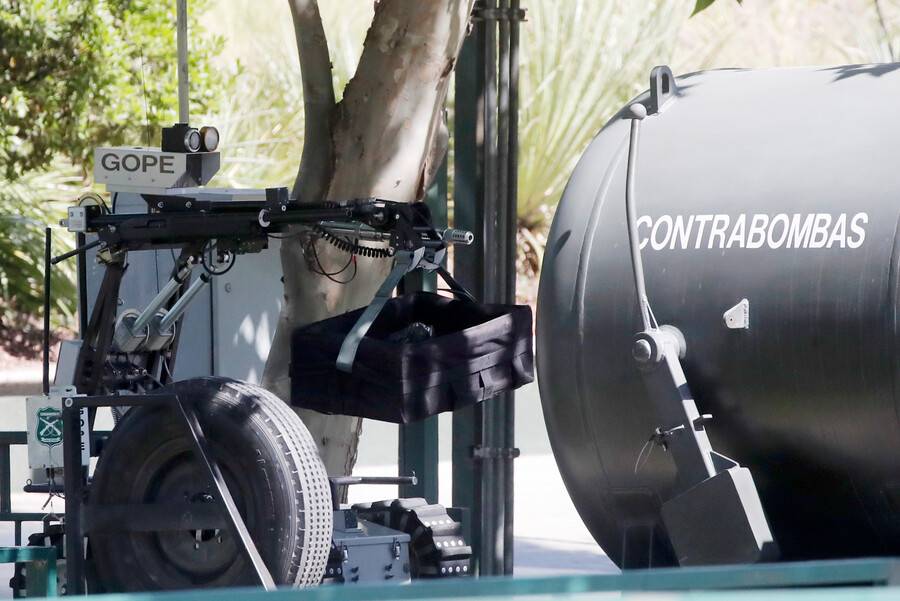 El objeto fue puesto en un contenedor especial para luego ser llevado a una unidad especializada donde será sometido a peritajes para establecer si se trataba de dispositivo explosivo real o simulado.
