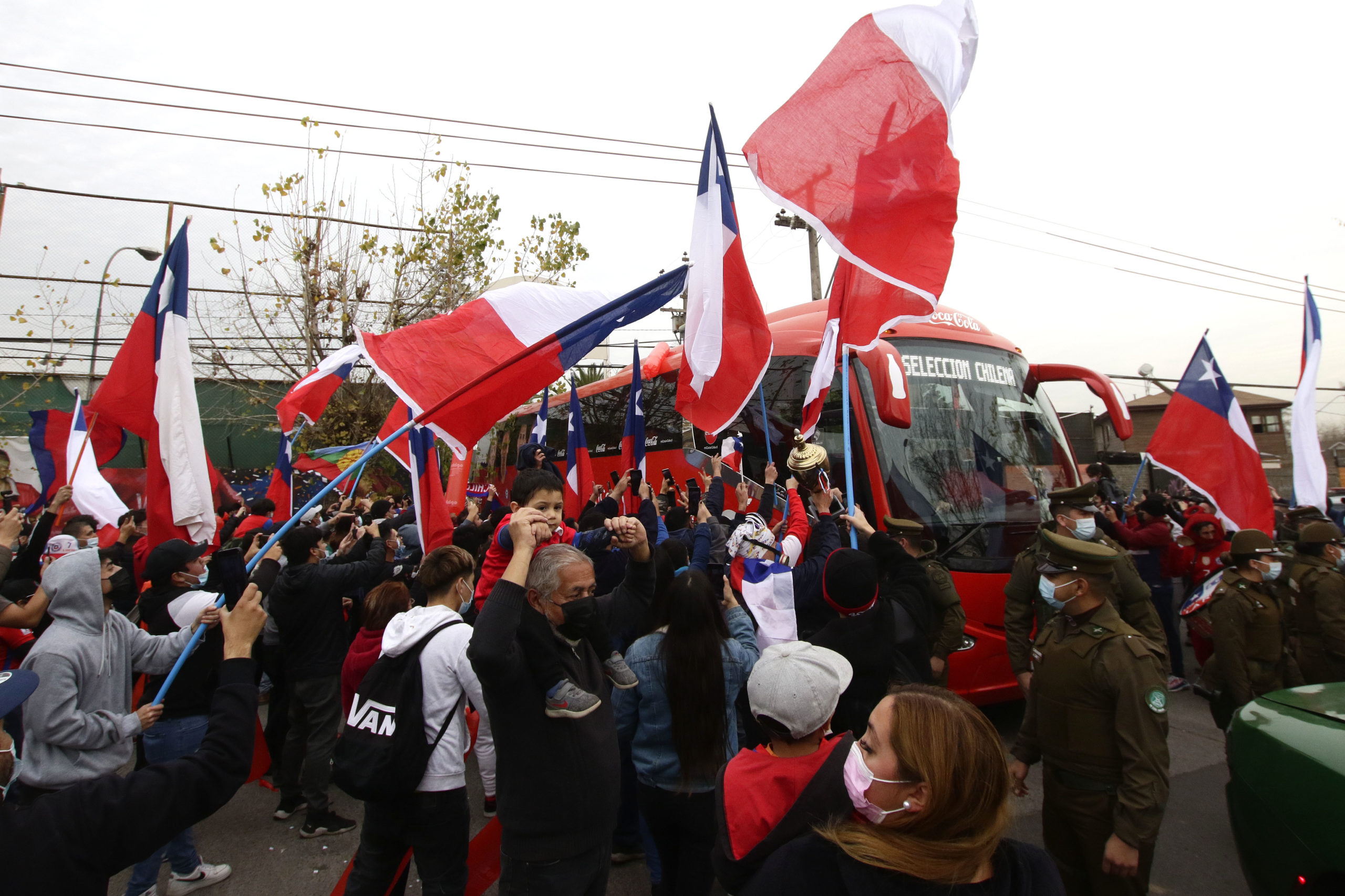 Enormes banderas y bengalas encendidas adornaban las calles aledañas al recinto de entrenamiento de la Roja, especialmente cuando el bus de la Selección abandonó Pinto Durán con los seleccionados a bordo para emprender rumbo al aeropuerto Arturo Merino Benítez. Incluso un curioso lienzo lució en una de las paredes con la siguiente frase: “Al covid le tenemos respeto, a Brasil no”.