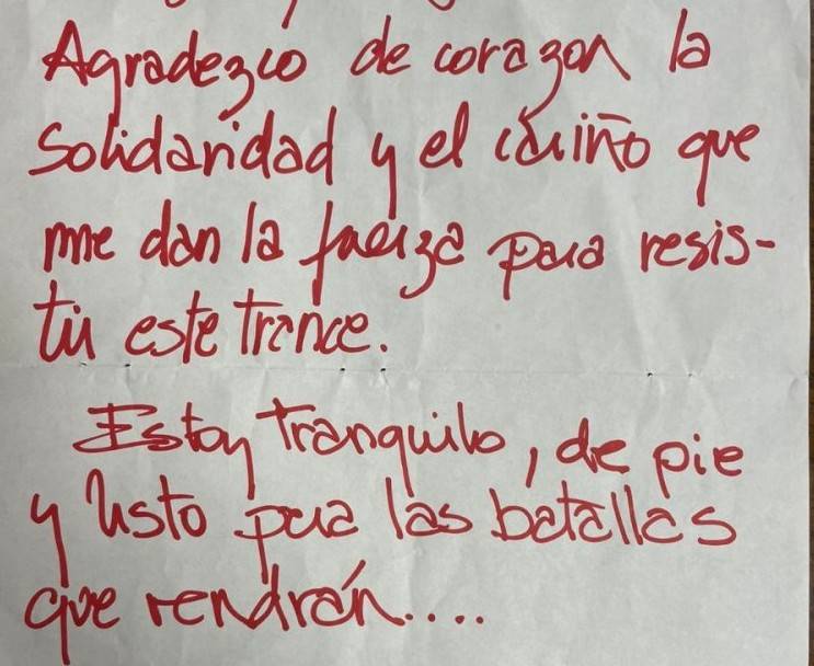 “Compañeros y compañeras, amigas y amigos, agradezco de corazón la solidaridad y el cariño que me dan la fuerza para resistir este trance”, escribió con lápiz tinta roja.