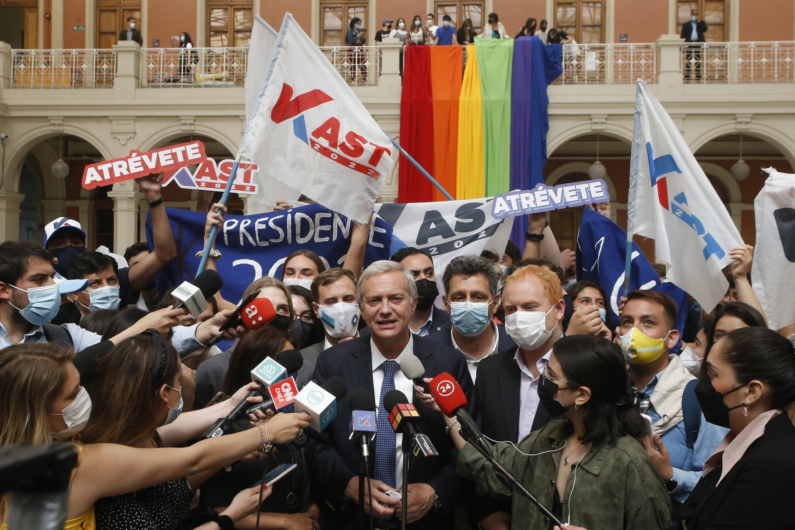Mientras Kast estaba realizando estas declaraciones, algunos estudiantes de la FEUC enarbolaron desde el segundo piso del establecimiento una gran bandera representativa de la diversidad sexual, manifestando su descontento por la presencia del postulante a mandatario en la casa de estudios.