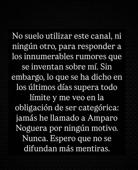 En este sentido, expresó que “me veo en la obligación de ser categórica: jamás he llamado a Amparo Noguera por ningún motivo. Nunca. Espero que no se difundan más mentiras”.