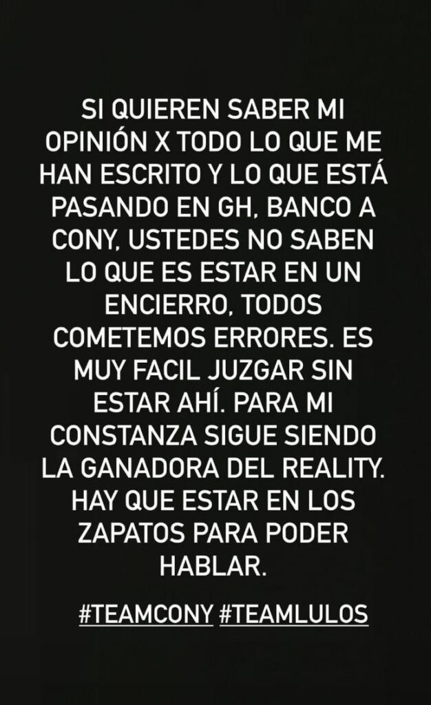 Por medio de sus historias de Instagram, Solar expresó que “si quieren saber mi opinión por todo lo que me han escrito y lo que está pasando en ‘Gran Hermano’, banco a Cony, ustedes no saben lo que es estar en un encierro”.