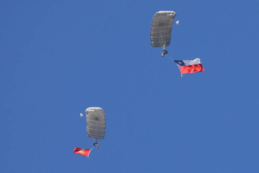 Desde un avión CN-235 de la Brigada de Aviación del Ejército, los efectivos se lanzaron desde una altura aproximada de 3.300 metros, mostrando precisión y coordinación. Entre ellos destacó la mayor Camila Orellana de La Fuente, perteneciente a la Escuela de Telecomunicaciones del Ejército, quien suma ya 1.600 saltos en su carrera y se ha especializado como paracaidista libre.