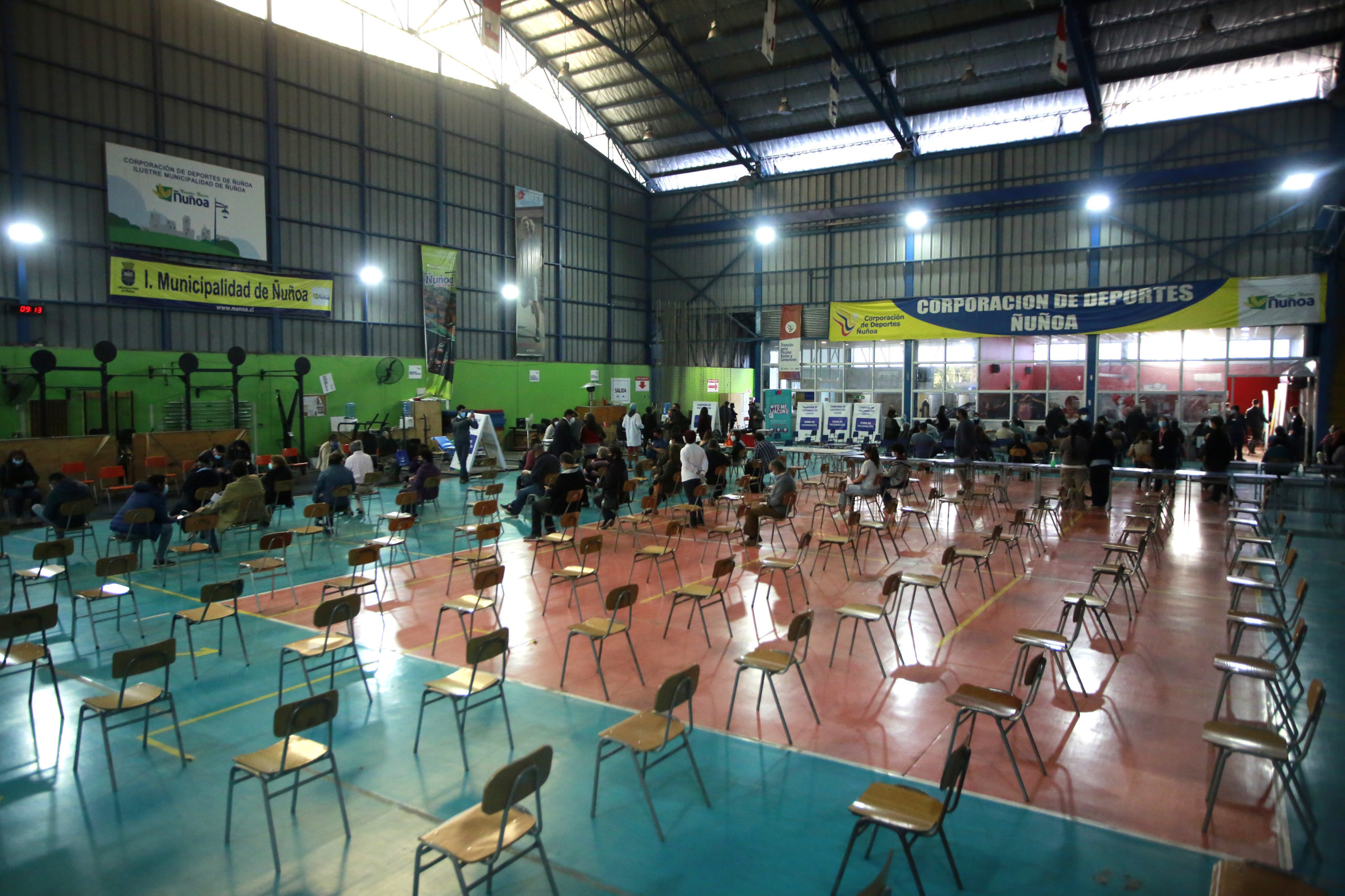 La subsecretaria de Salud Pública, Paula Daza, junto al vocero de La Moneda, Jaime Bellolio, y al alcalde de Ñuñoa, Andrés Zarhi, dieron inicio, en el Polideportivo de la comuna, al proceso de vacunación de población sana, con las personas de 59 años.