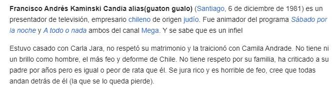 Y es que a raíz de la supuesta relación que habría tenido Kaminski con Camila Andrade, los usuarios en internet cambiaron la biografía del comunicador en Wikipedia, y arremetieron en su contra por esta presunta infidelidad.