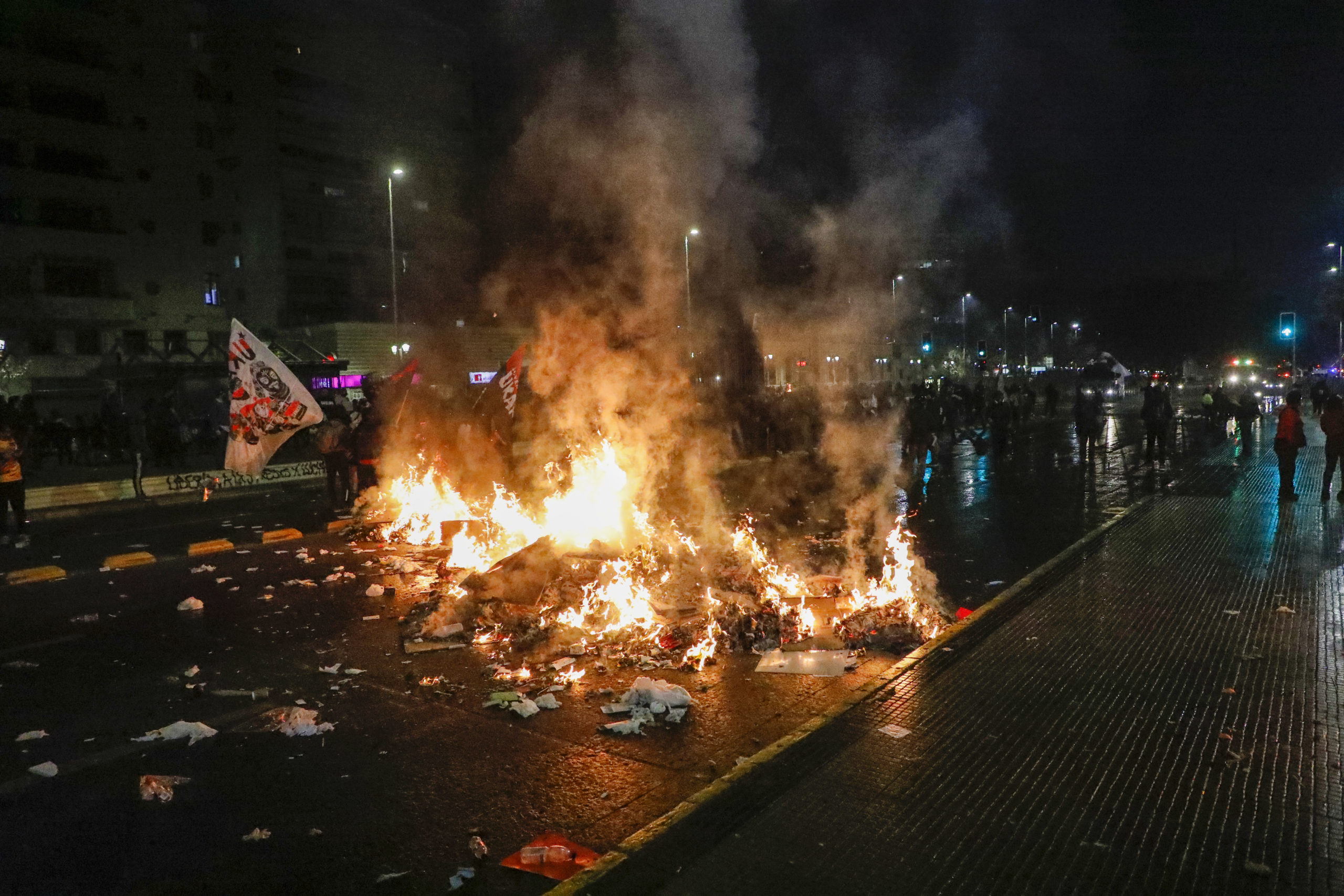 “Antisociales levantan barricadas en la intersección de Alameda con Estado, cortando el tránsito en el sector. Prefiera vías alternativas”, indicó la policía uniformada. Aún no se reportan detenidos pese a que personal de Control de Orden Público ya intervino en el lugar.