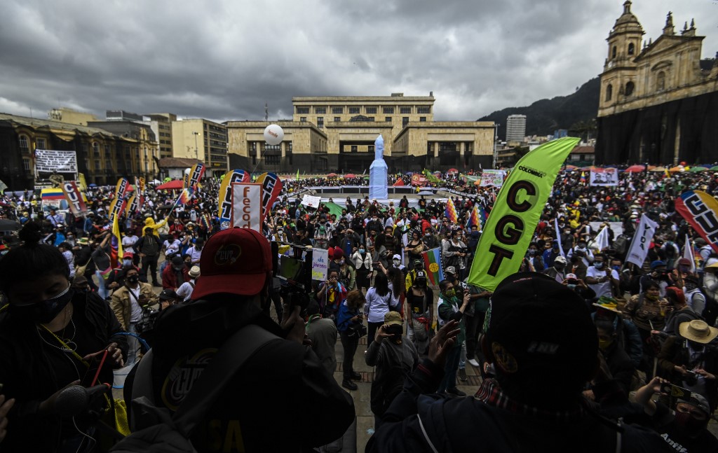 “Aquí está expresada la policromía de la sociedad colombiana (…) que reclama unos derechos y una atención en medio de las dificultades, porque Duque ni dialoga ni negocia”, dijo a la AFP Fabio Arias, dirigente de la Central Unitaria de Trabajadores (CUT), uno de los sindicatos más poderosos.