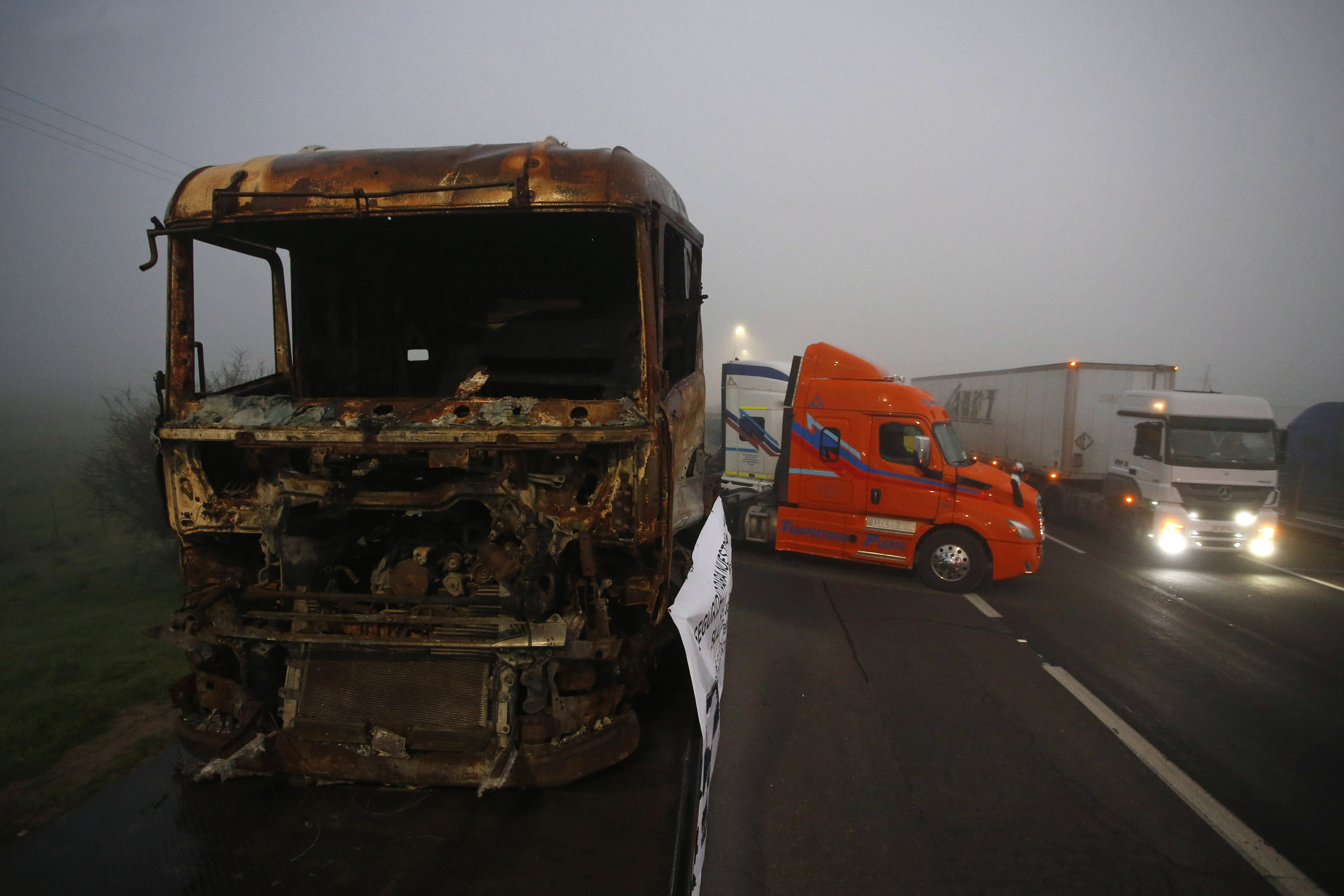 Los asociados de Fedequinta, que agrupa a los transportistas de carga de la Región de Valparaíso, principalmente, se encuentran reunidos en el sector del Santuario de Lo Vásquez de la Ruta 68 , donde hay unos 100 camiones que permiten el tránsito solo por una vía. Además, los transportistas están mostrando algunas máquinas quemadas.
