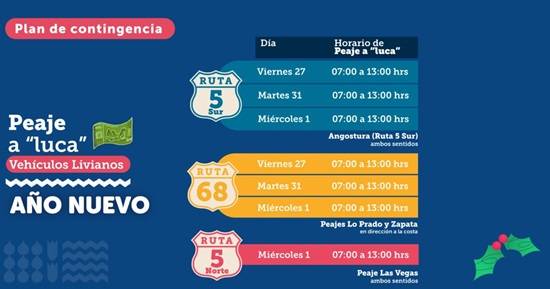 Tal como en años anteriores, miles de personas saldrán de la Región Metropolitana por las celebraciones de Año Nuevo, y por lo mismo, el Ministerio de Obras Públicas (MOP) está llevando a cabo un plan de contingencia, que contempla la popular medida del “peaje a luca”.