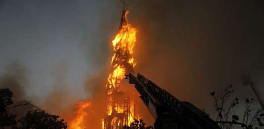 El Departamento OS9 de Carabineros realizó peritajes tras el incendio que afectó a las iglesias Francisco de Borja (de la institución) y La Asunción, en Avenida Vicuña Mackenna. Los investigadores establecen preliminarmente, en un número importante de imágenes analizadas, que “los desplazamientos no son al azar”.