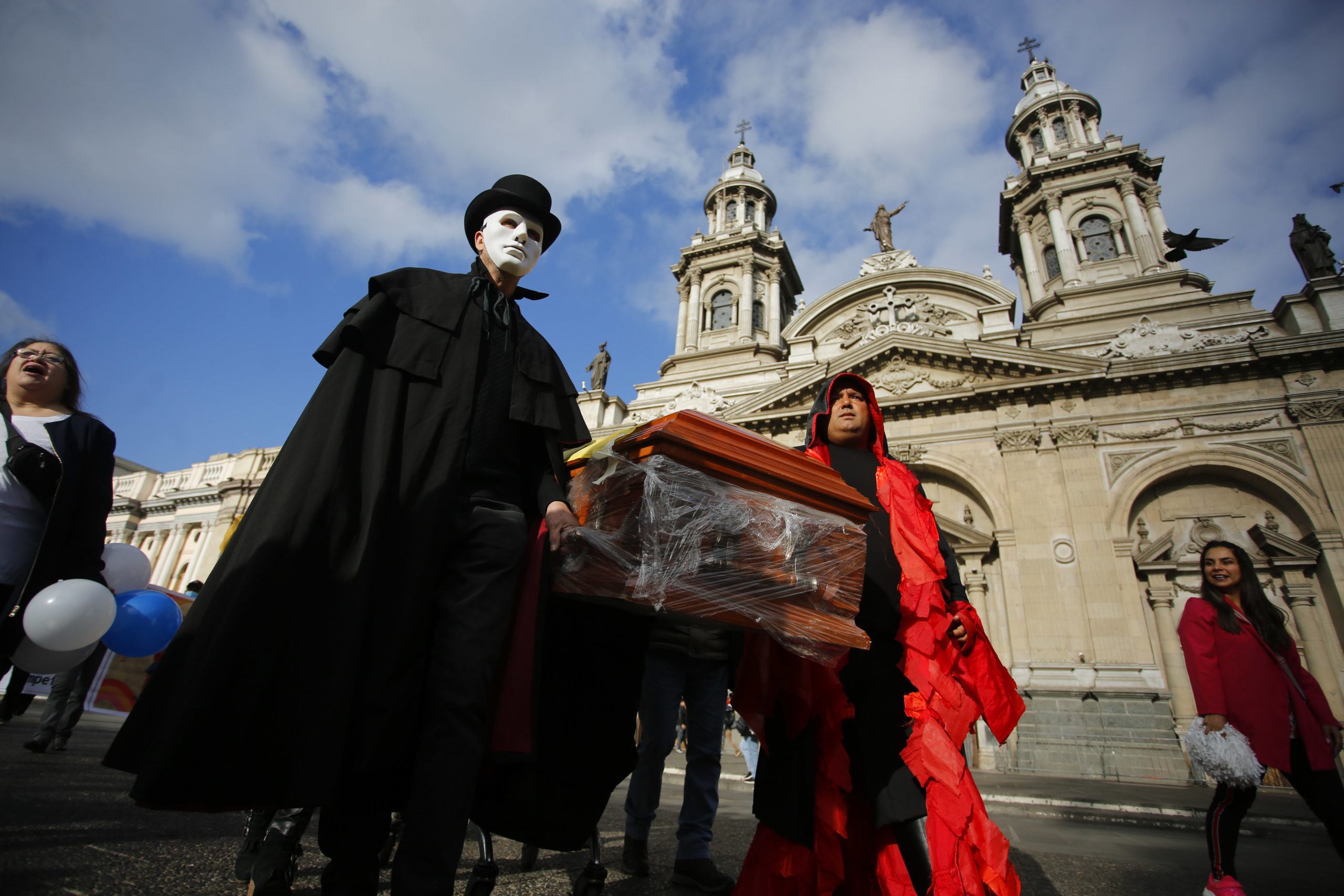 Los manifestantes se dirigen a la municipalidad en un cortejo fúnebre, algunos vestidos de sepultureros, bajo la consigna de que “Santiago agoniza”.