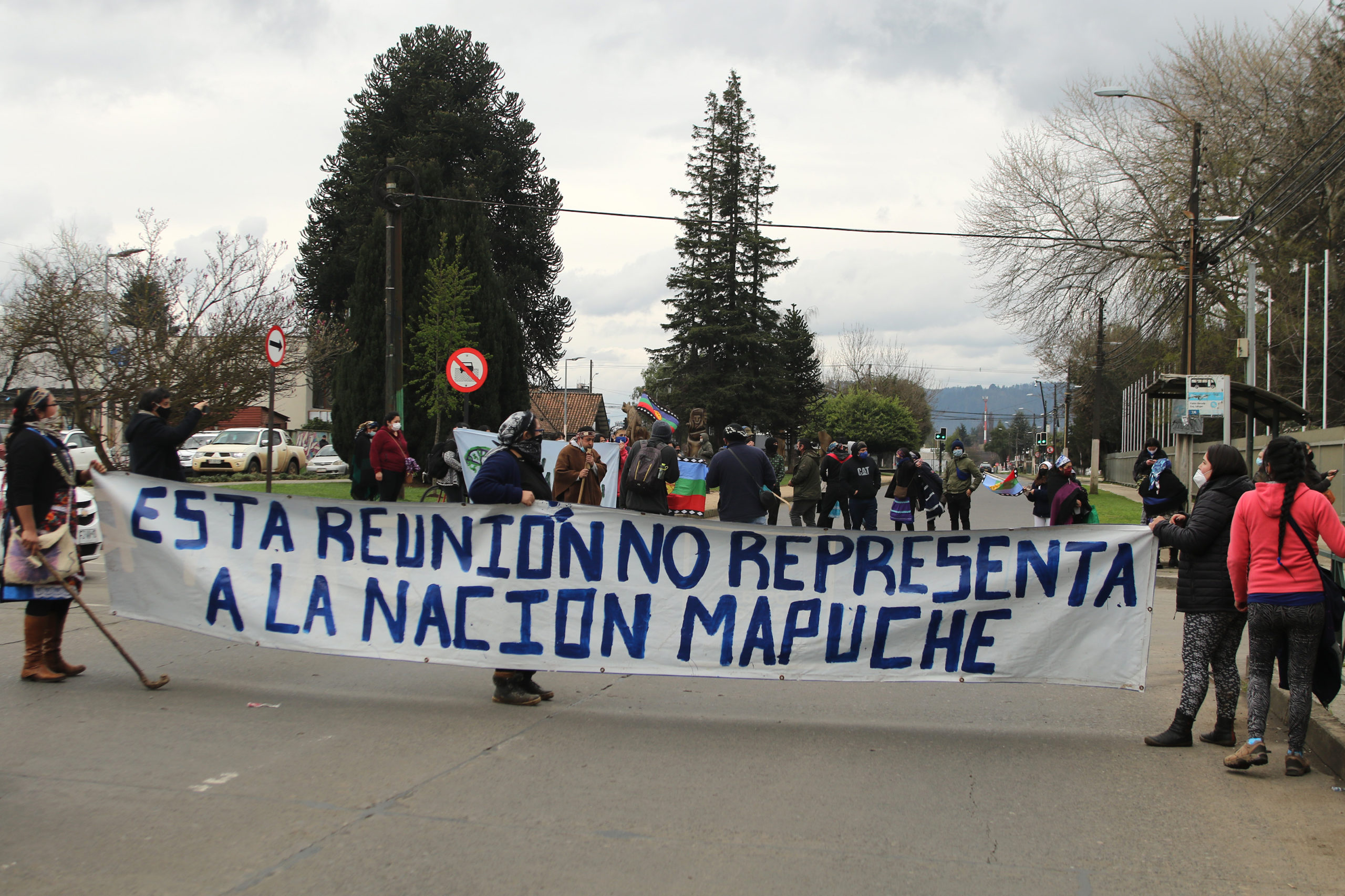 En las afueras del estadio, grupos de comuneros alegaban falta de representatividad del Consejo de Lonkos y Machis.