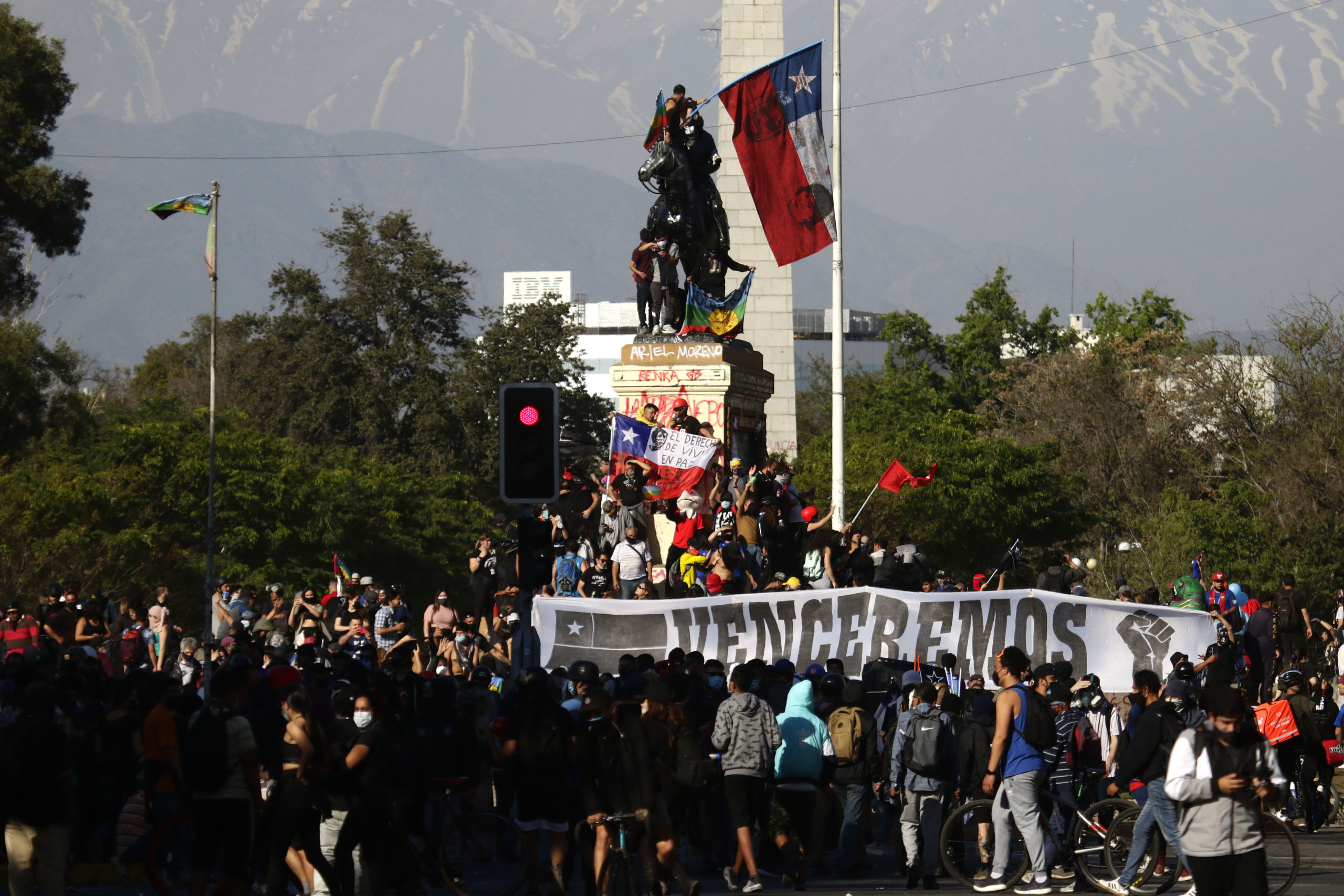 A una semana de que un carabinero presuntamente empujara a un adolescente desde el puente Pío Nono al río Mapocho, según acusó la fiscalía, unos 200 manifestantes se encuentran en la céntrica rotonda gritando consignas contra el Presidente Piñera, mientras la policía intenta dispersarlos con carros lanzaagua y gases lacrimógenos.