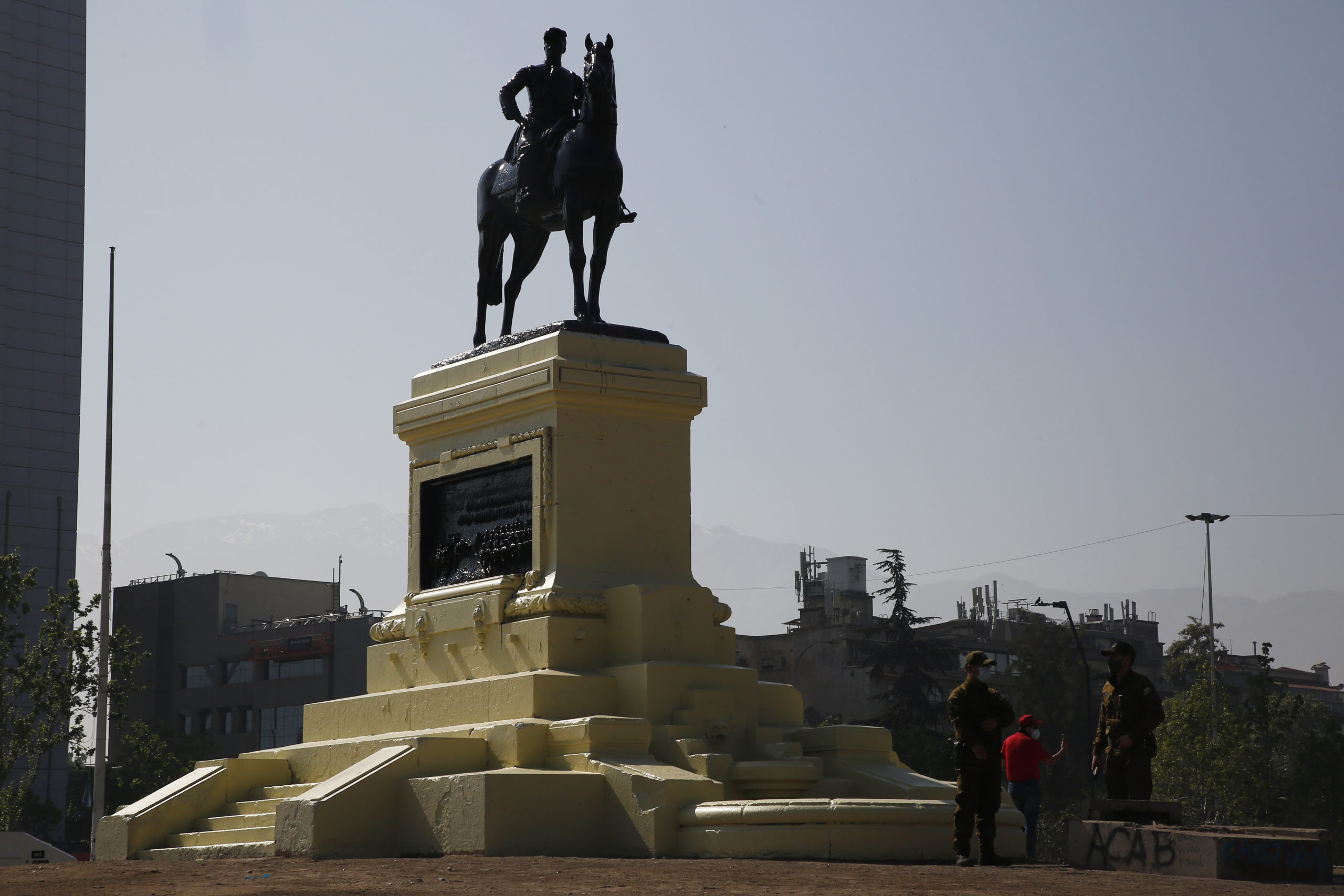 Durante los incidentes del viernes, un grupo de encapuchados pintó complemente de rojo el monumento, en un supuesto homenaje a las víctimas de violaciones a los derechos humanos durante el estallido social, que mañana cumple un año.