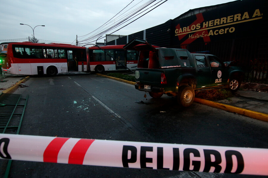 Un violento choque se produjo este lunes entre un vehículo de Gendamería y un bus del Transantiago, en el sector de Santa Rosa con Carlos Valdovinos, en la comuna de San Miguel.