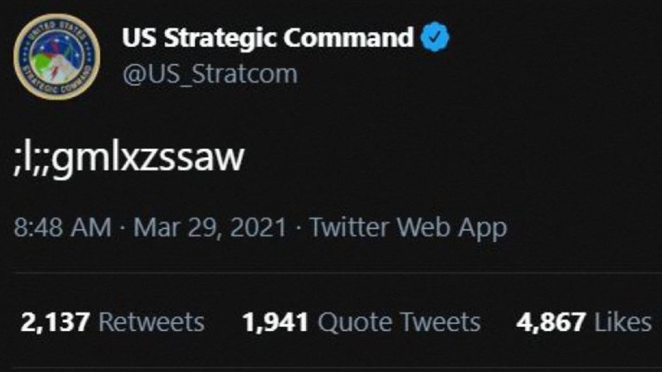 “;l;;gmlxzssaw,”, pudieron leer el domingo los internautas en la cuenta oficial del Comando Estratégico (Stratcom), división encargada del control militar de todo el arsenal nuclear nacional, antes de que el tuit fuera suprimido.