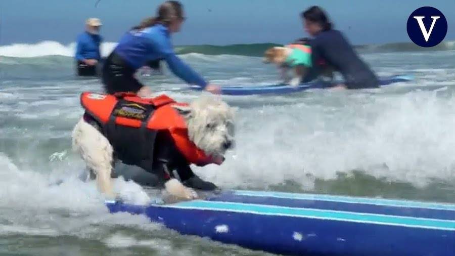 Diez perros californianos se preparan para el Surf-A-Thon. Los animales entrenan junto a sus dueños para familiarizarse con las tablas de surf blandas, los flotadores caninos y las normas de seguridad en el agua. Scott Owens, instructor de perros surferos, cuyos dos dálmatas, Bentley y Bailey, suelen andar sueltos con él por el agua, dijo que compartir las olas con sus perros es una experiencia única que suele atraer a una multitud.