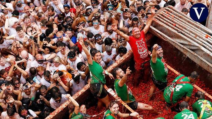 A las 12 del mediodía en España, los camiones cargados con esa atípica munición festiva comenzaron a recorrer lentamente la calle principal de la ciudad hispana. En el lugar repartieron miles de kilos de tomate de la variedad pera blandos y maduros, no aptos para el consumo pero sí como proyectiles, suministrados por la empresa Frutas y Verduras Massanasa de Silla.