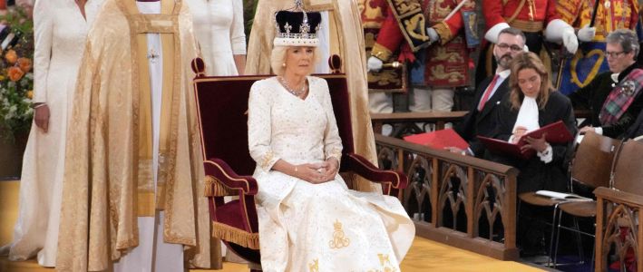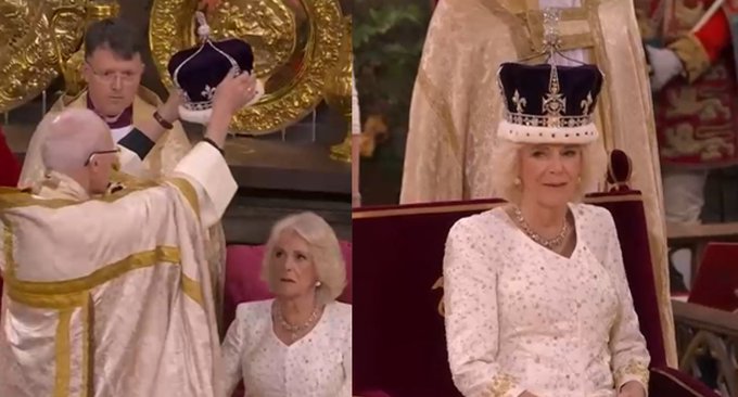 La reina Camila fue primero ungida con aceite en la cabeza por el arzobispo de Canterbury, primado de la Iglesia Anglicana, quien posteriormente impuso en su cabeza la corona de la Reina María.