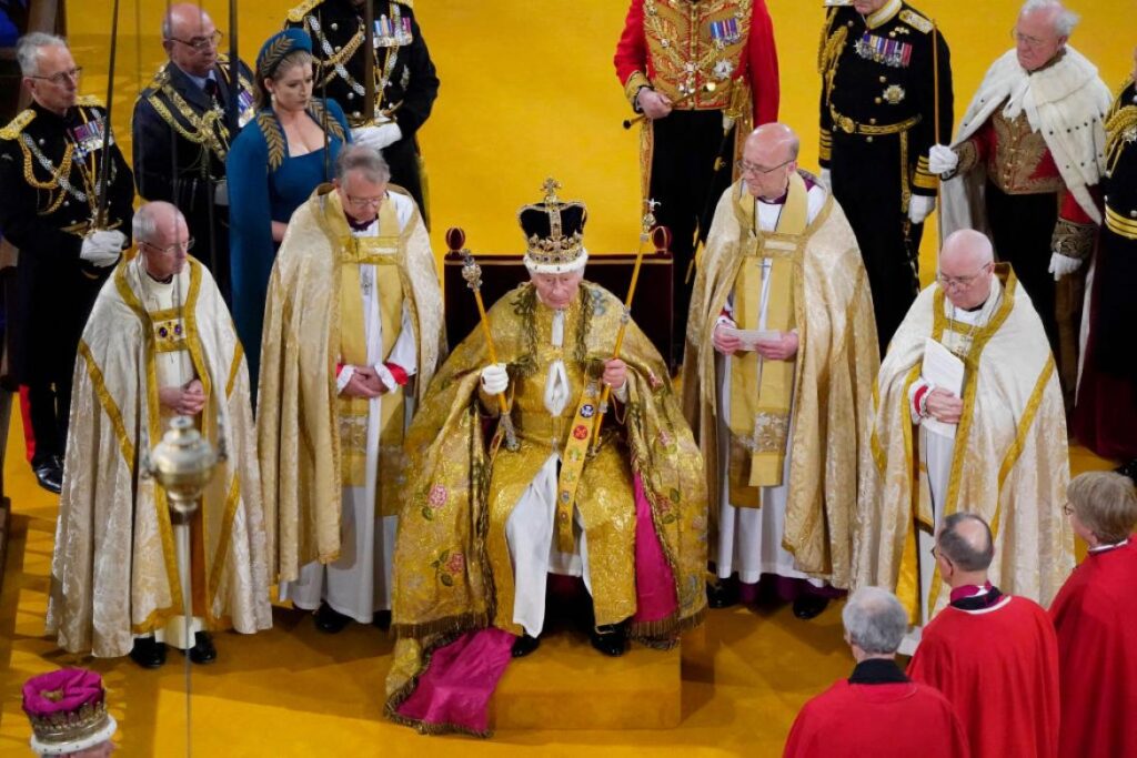 En el momento más importante de este acto protocolario, el arzobispo de Canterbury, Justin Welby, colocó sobre la cabeza de Carlos III la suntuosa corona de San Eduardo, del siglo XVII.