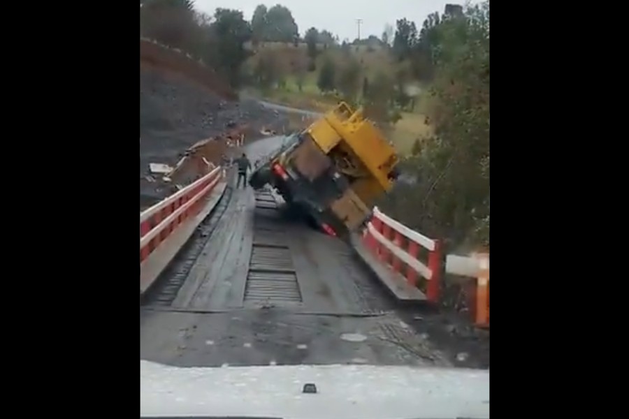 En el registro se puede ver como al caer los tablones del puente, el camión comenzó a inclinarse hacia un costado, con el conductor arriba junto a un acompañante, quienes en el último momento lograron salir del vehículo y evitar una tragedia.