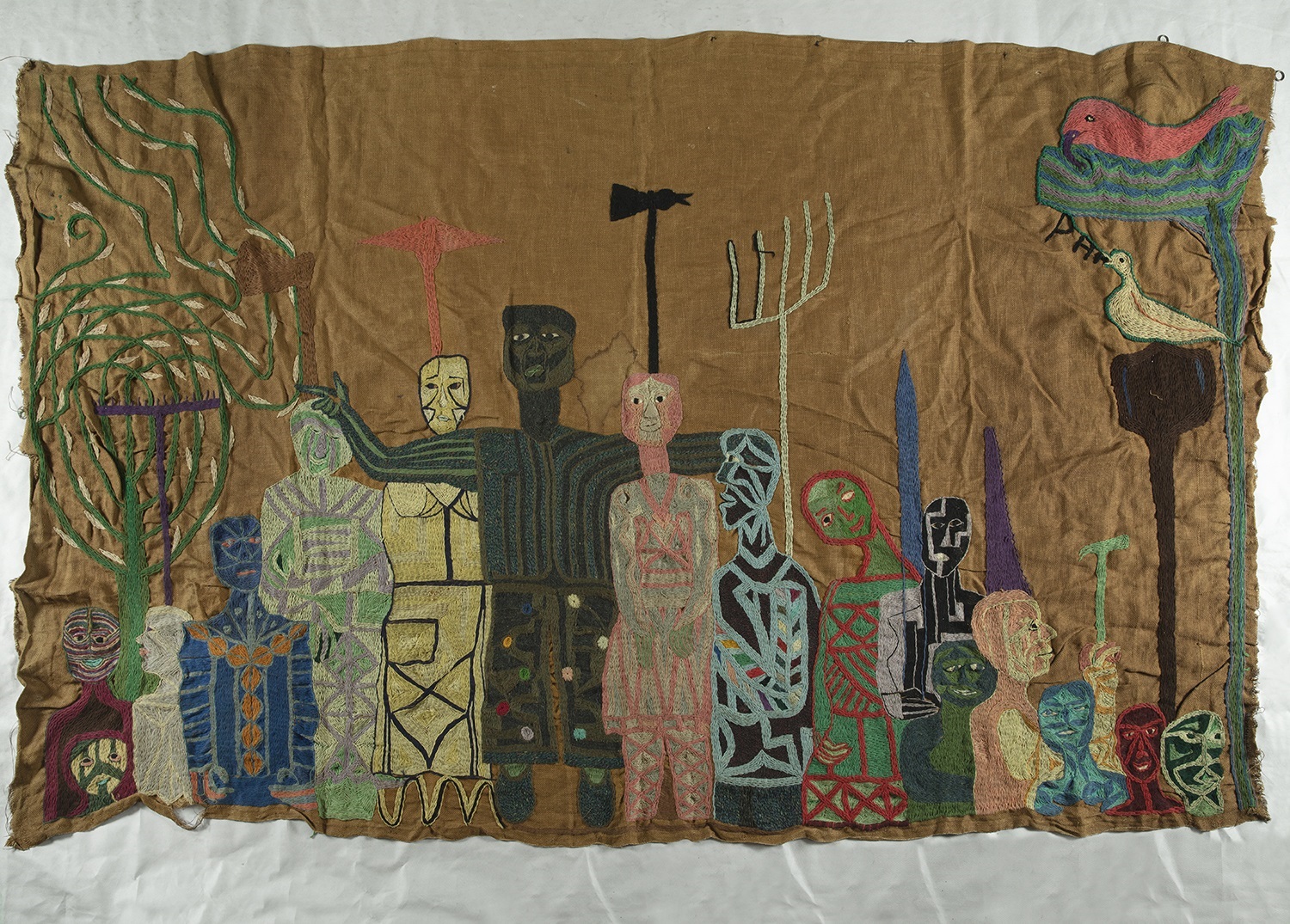 El diseño, a cargo de los artistas Bernardo Oyarzún y Adrián Gutiérrez, con la participación del museógrafo, Santiago Aránguiz, muestra, por primera vez en Chile, la arpillera “La Huelga de los Campesinos”, que fue adquirida recientemente por el Museo Violeta Parra, y la obra “Justice”, donada por Michele Saffar.