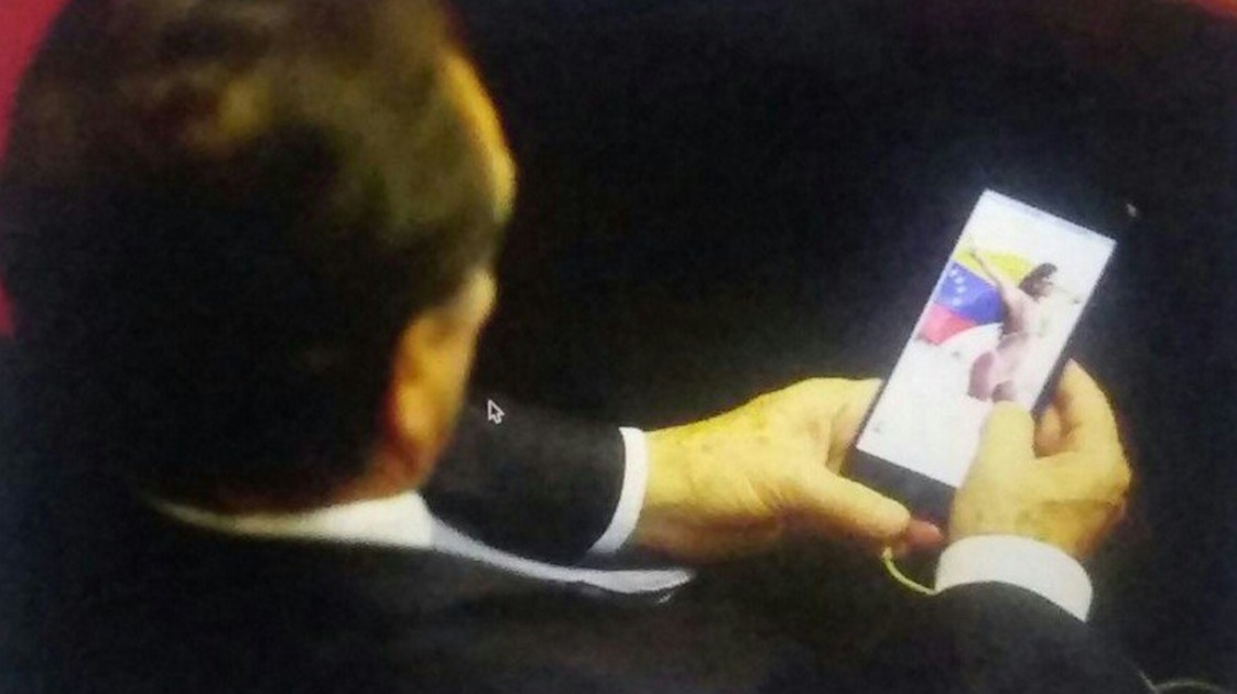 En una curiosa situación se vio envuelto el congresista peruano Héctor Becerril, quien fue captado por el medio Chicharrones de Prensa, observando en su celular la fotografía de una modelo venezolana en bikini.